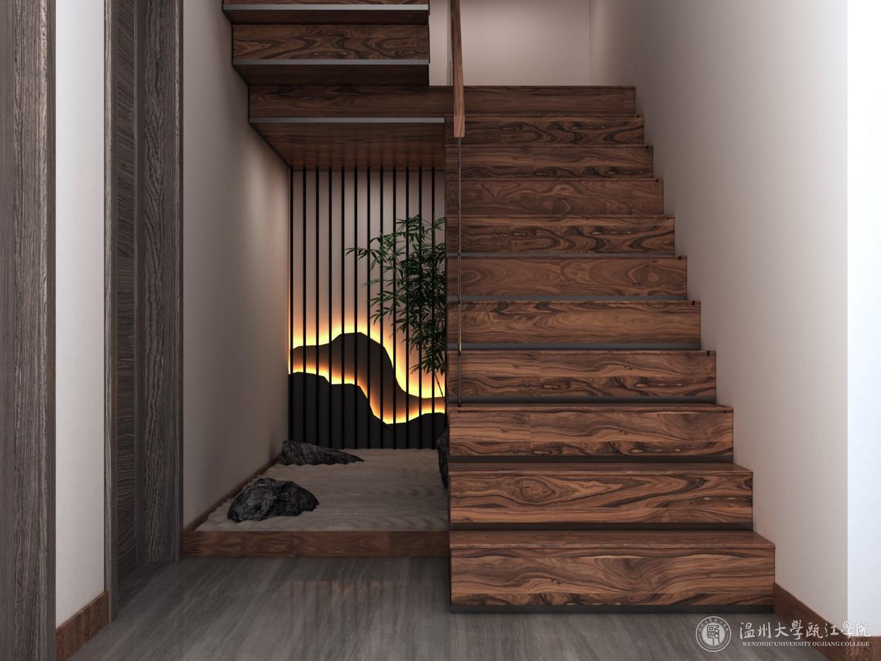 在设计本案时,通过运用不同的材质来营造不一样的生活品质,利用中式茶盏、金属摆件、光影效果来营造不一样的视觉空间。设计用材上选取米黄石、胡桃木、木纹砖、金属饰面等,严格控制别墅空间中材料的种类选择。在客厅茶几上摆放中式茶盏,一旁纤细柔美的绿植尽显向上生长的秀逸神韵,再搭配上黄铜装饰,让整个空间多了一些层次和韵味;在楼梯间设计独特的造景,巧妙的将自然景观融入到设计之中,打造出一种特别的意境,让人可以沉浸其中,引起心灵上的一种共鸣。