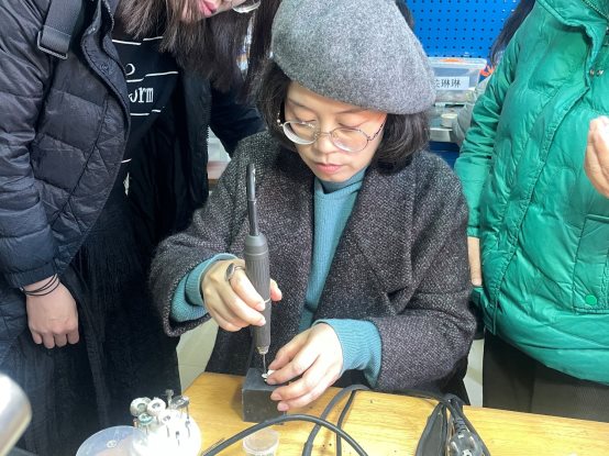 三位教师带领学员学习纯银粘土饰品的制作技法,并运用理论授课与实践操作相结合的方法。在教师的指导下,学员将全面了解纯银粘土的特性与制作工艺,并将所学知识灵活应用于美术及跨学科项目式教学。这一学员实践旨在培养动手能力和问题解决思维,为学员在美育领域的未来教学活动提供丰富经验,同时为课堂注入新的创意和活力。