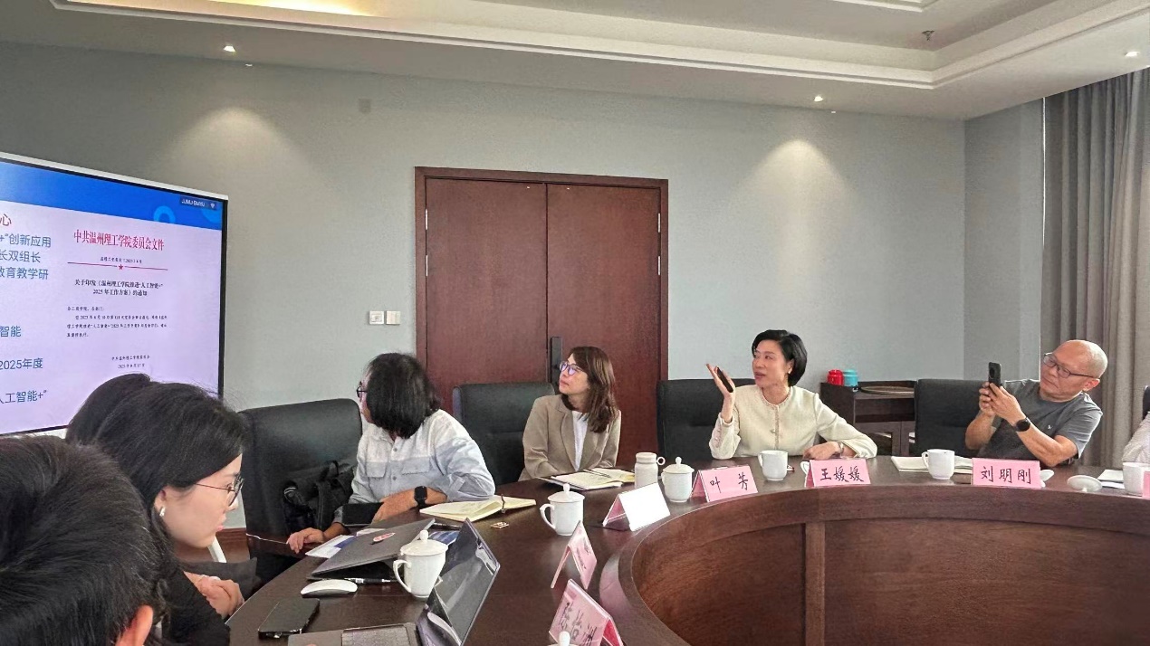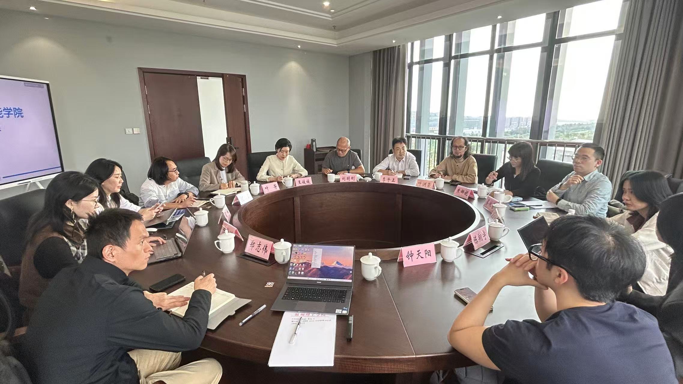 王媛媛委员首先就学校立足地方产业需求的人才培养定位与模式作了阐述,并重点介绍了学校为应对AI技术发展趋势所构建的软硬件支撑体系。刘明刚院长随后介绍了设计艺术学院在学生培养、师资队伍建设、学科竞赛成果以及省级重点实验教学示范中心与省级"瓯越百工"传统工艺工作站等方面取得的突出成绩。
